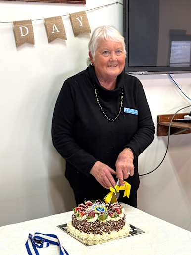 Member Jackie Cartwright cutting the Birchip Probus 20th birthday cake in memory of her father Ken Kemp who was the inaugural president.