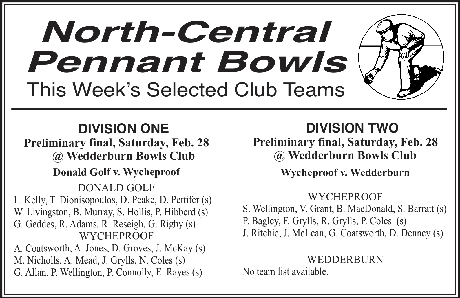 Sport NC Bowls North Central Pennant Bowls | Grand Final Teams by Buloke Times Published February 26, 2026 Link copied! Copy failed! Selected club teams for the garnd final - Saturday, February 28, 2026 Updated February 27, 2026 6:26 am | 13 days ago Link copied! Copy failed!