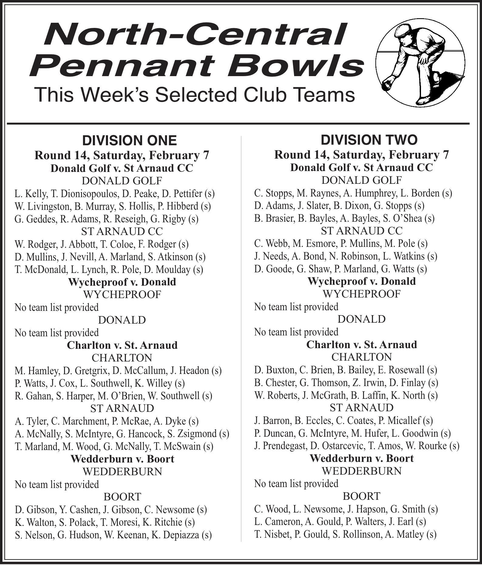 Sport NC Bowls North Central Pennant Bowls Teams by Buloke Times Published February 06, 2026 Link copied! Copy failed! Selected club teams for round 14 - Saturday, February 7, 2026 Updated February 13, 2026 6:59 am | 2 months ago Link copied! Copy failed!